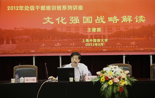 2012年5月25日下午,我校处级干部培训班举行系列讲座第二讲,上海市委党校马克思主义研究院常务副院长王建国教授为全校处级干部培训班作了题为“文化强国战略解读”的报告。校党委组织部副部长王一林主持了报告会。