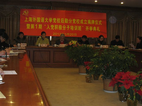 3月20日下午,上海外国语大学后勤实业发展中心分党校成立揭牌仪式暨首期入党积极分子培训班开班典礼在虹口校区会议中心英伦厅举行。校党委常委、副校长周承,校老领导盛裕良,校党委组织部部长张静,校后勤中心领导班子成员、后勤各部门负责人和全体入党积极分子出席了成立揭牌仪式暨开班仪式。校后勤中心党总支书记张明主持了成立大会。