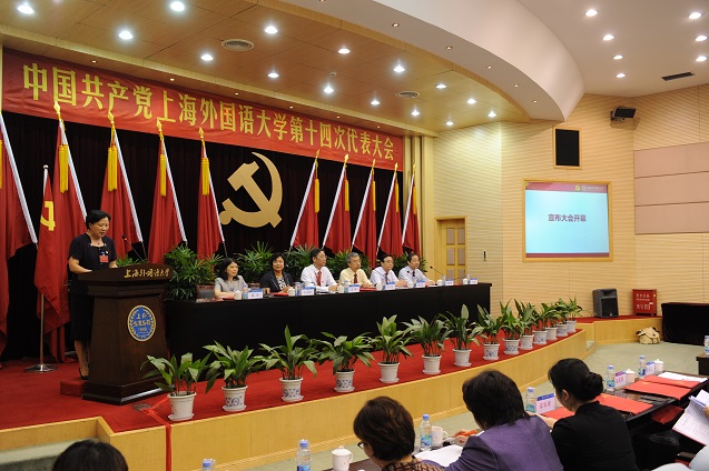 大会会场设在虹口校区会议中心。主席台上方正中悬挂着中国共产党党徽,两边是十面鲜艳的红旗。会场内“诠释世界 成就未来”“格高志远 学贯中外”“服务人的全面成长、服务国家发展、服务社会进步、服务中外人文交流”的标语格外醒目。